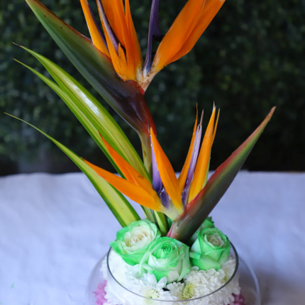 Exotic Flower Vase Arrangement – Pink roses, orchids & Bird of Paradise in designer vase with tropical leaves.