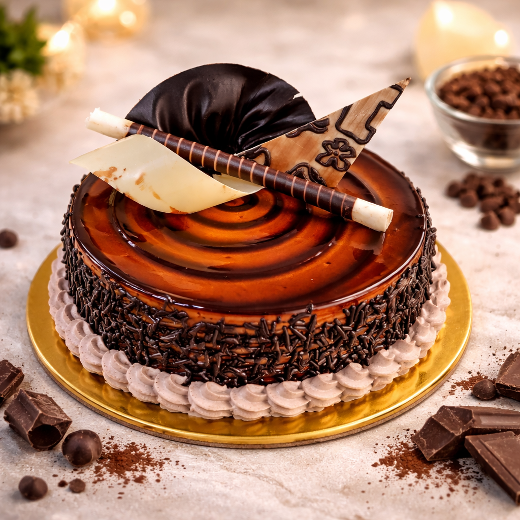 Each slice offers a soft and moist chocolate sponge that melts in your mouth. A silky caramel layer covers the top and gives the cake its attractive glossy look. Elegant chocolate curls and artistic dark chocolate décor enhance both taste and presentation.