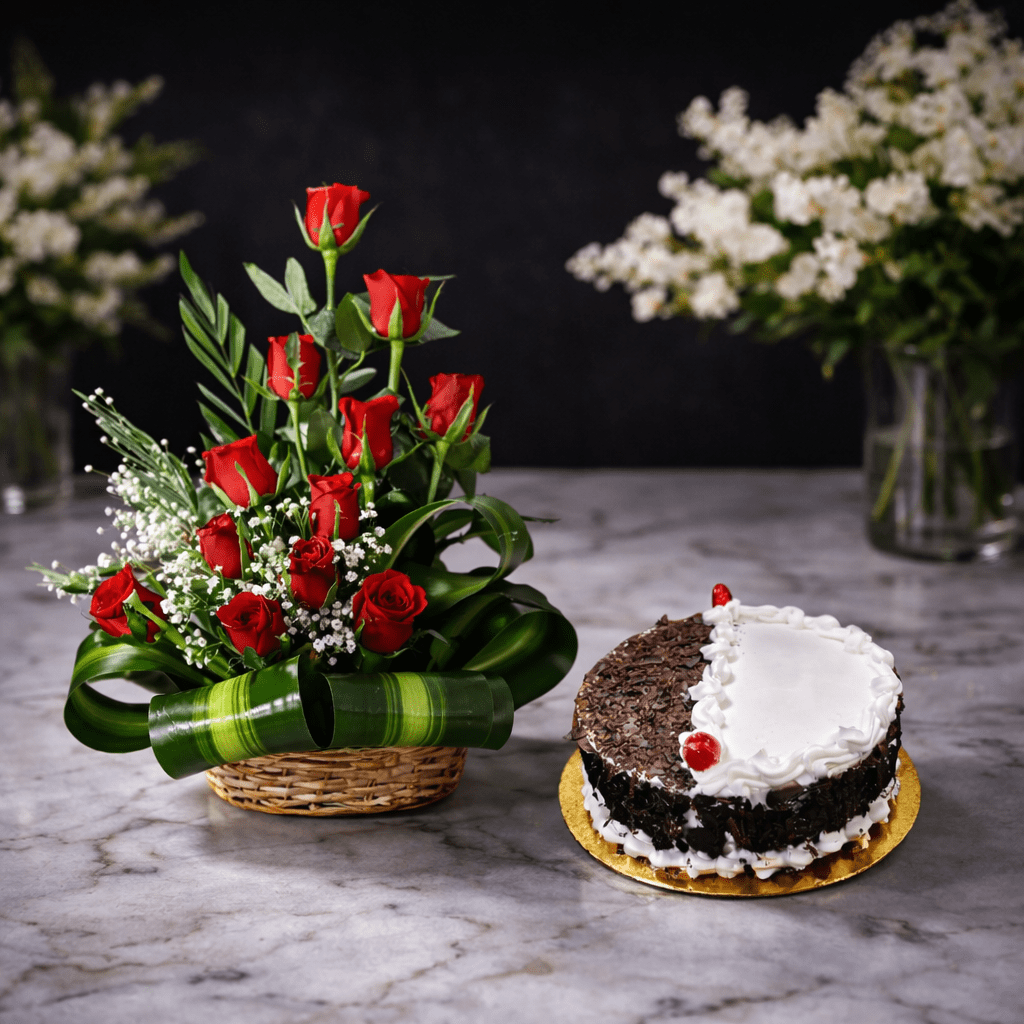 Celebrate special moments with the Crimson Love Combo, a thoughtfully designed gift that blends classic romance with irresistible sweetness. This elegant combo includes a beautifully arranged basket of red roses paired with a delicious Black Forest cake. Together, they create a perfect surprise that speaks the language of love and celebration.