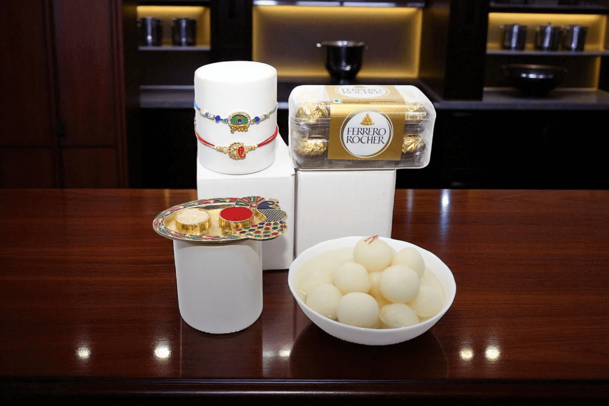| Bless your brother with divine protection and sweetness this Raksha Bandhan. This premium combo features a Krishna Rakhi and a Ganpati Rakhi, representing wisdom and love, paired with 16 pieces of Ferrero Rocher chocolates and 1kg of delicious rasgulla. A spiritually rich and luxurious gift for a cherished sibling. Note: Roli chawal plate, tray, and background elements shown in the image are for photography purposes only. Only the items mentioned in the short description will be delivered. Delivery Disclaimer: This is a seasonal gifting product. Orders may be delivered 2–3 days before Raksha Bandhan to ensure timely arrival. |