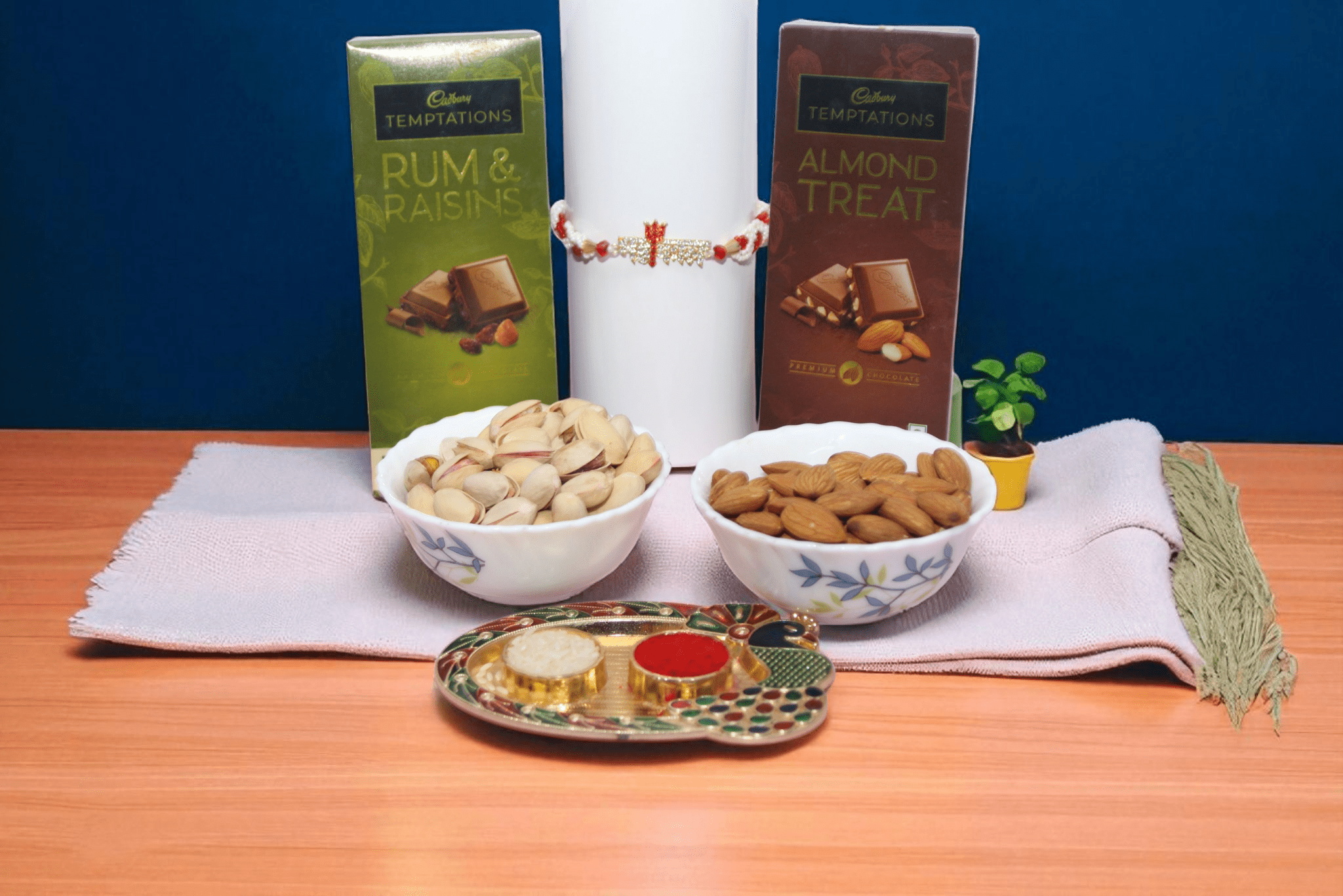 Peacock Pooja Thali, dry fruit bowls, Rakhi stand, and other background elements shown in the image are not for sale and used only for display purposes.