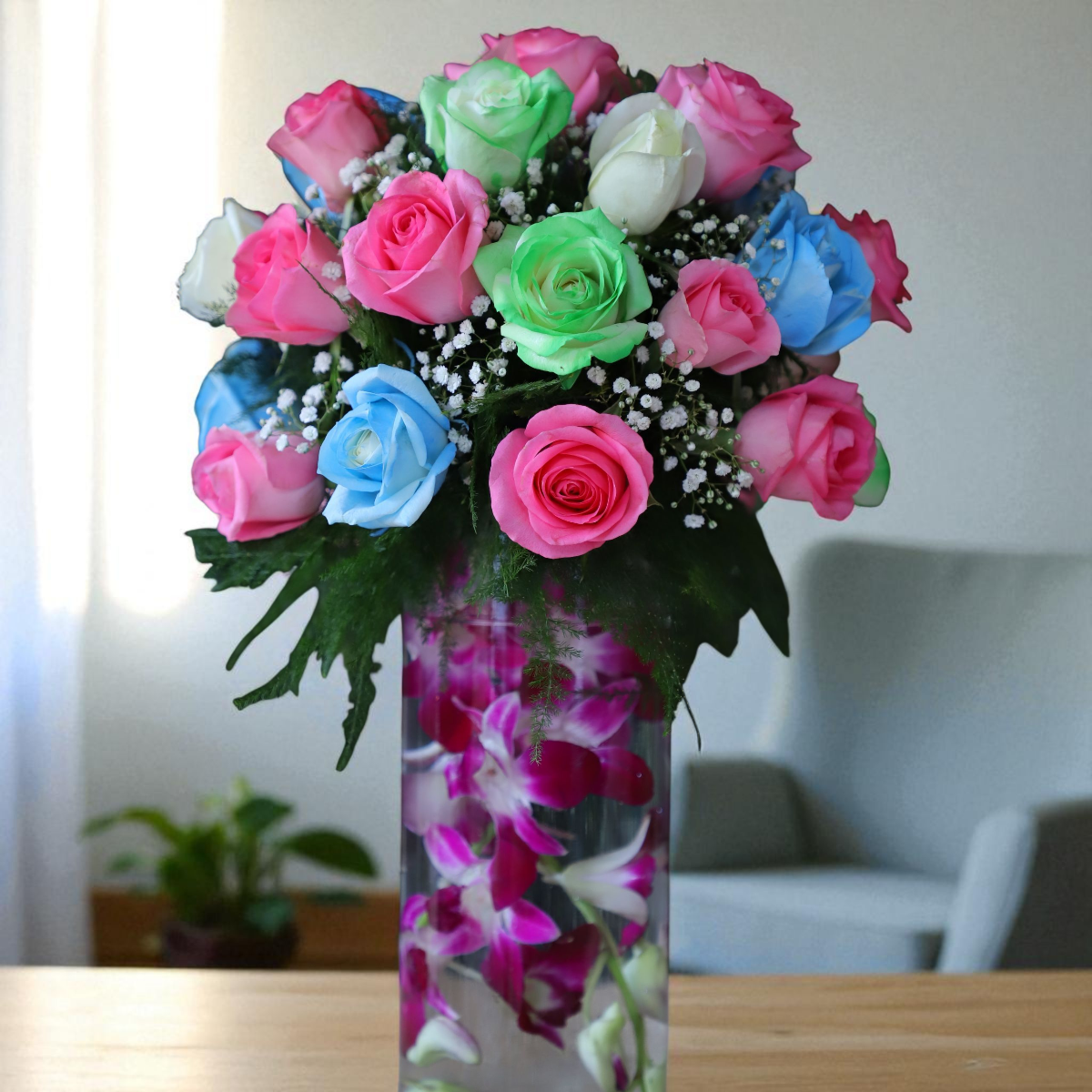 Add a vibrant touch of elegance to any celebration with this Multicolor Roses Flower Vase. Featuring a stunning mix of pink, blue, green, and white roses arranged beautifully in a tall glass vase, this floral arrangement is further enhanced with orchids layered at the base. Its stylish design and rich colors make it a standout centerpiece for gifting as well as home décor.