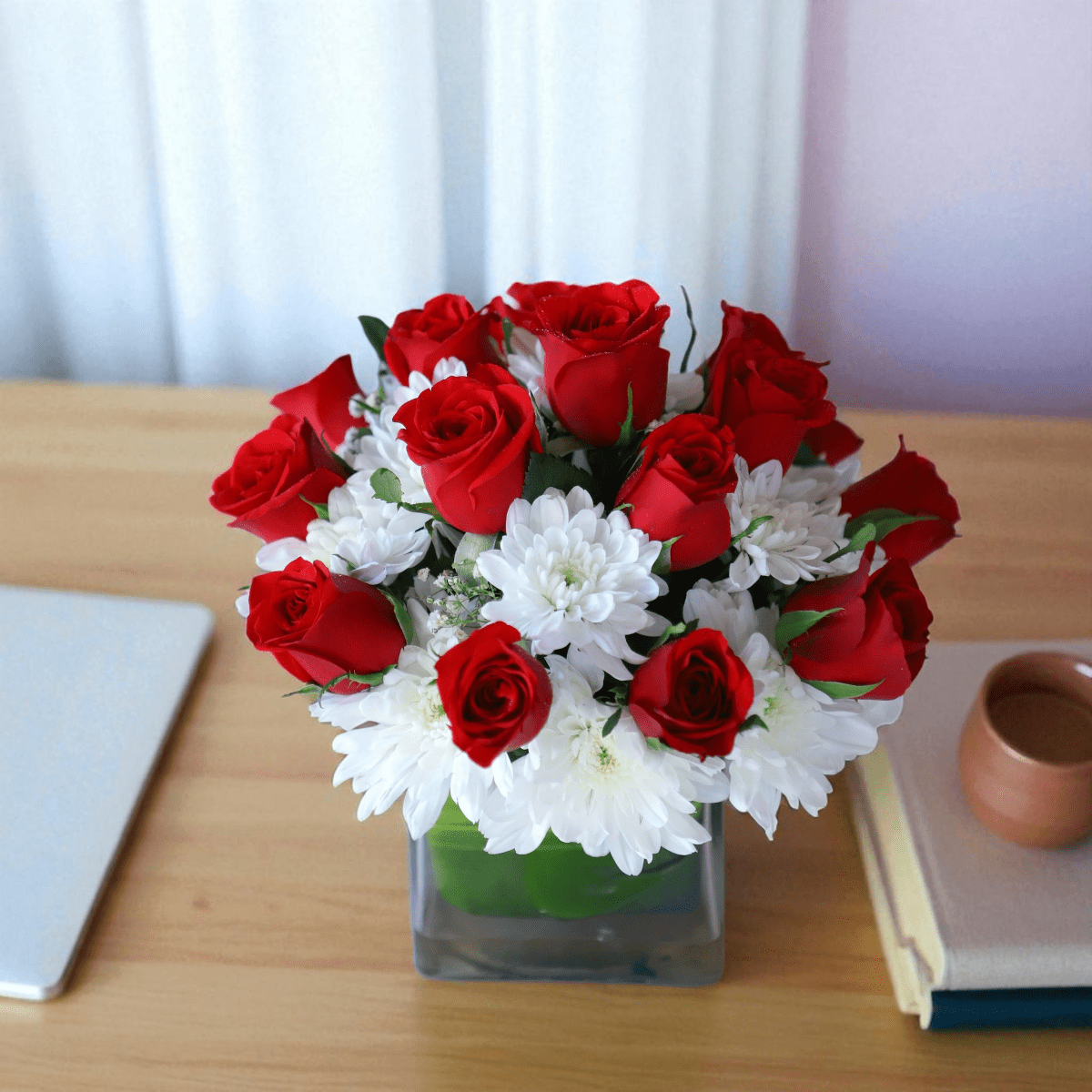 Red roses symbolize love, admiration, and romance, while white daisies represent innocence, sincerity, and peace. Together, this Red Roses & Daisies vase conveys emotions of warmth, positivity, and affection. Moreover, the chic square vase enhances its modern appeal, making it a wonderful choice for birthdays, anniversaries, or festive celebrations. As a result, this arrangement becomes a thoughtful gift that leaves a lasting impression.