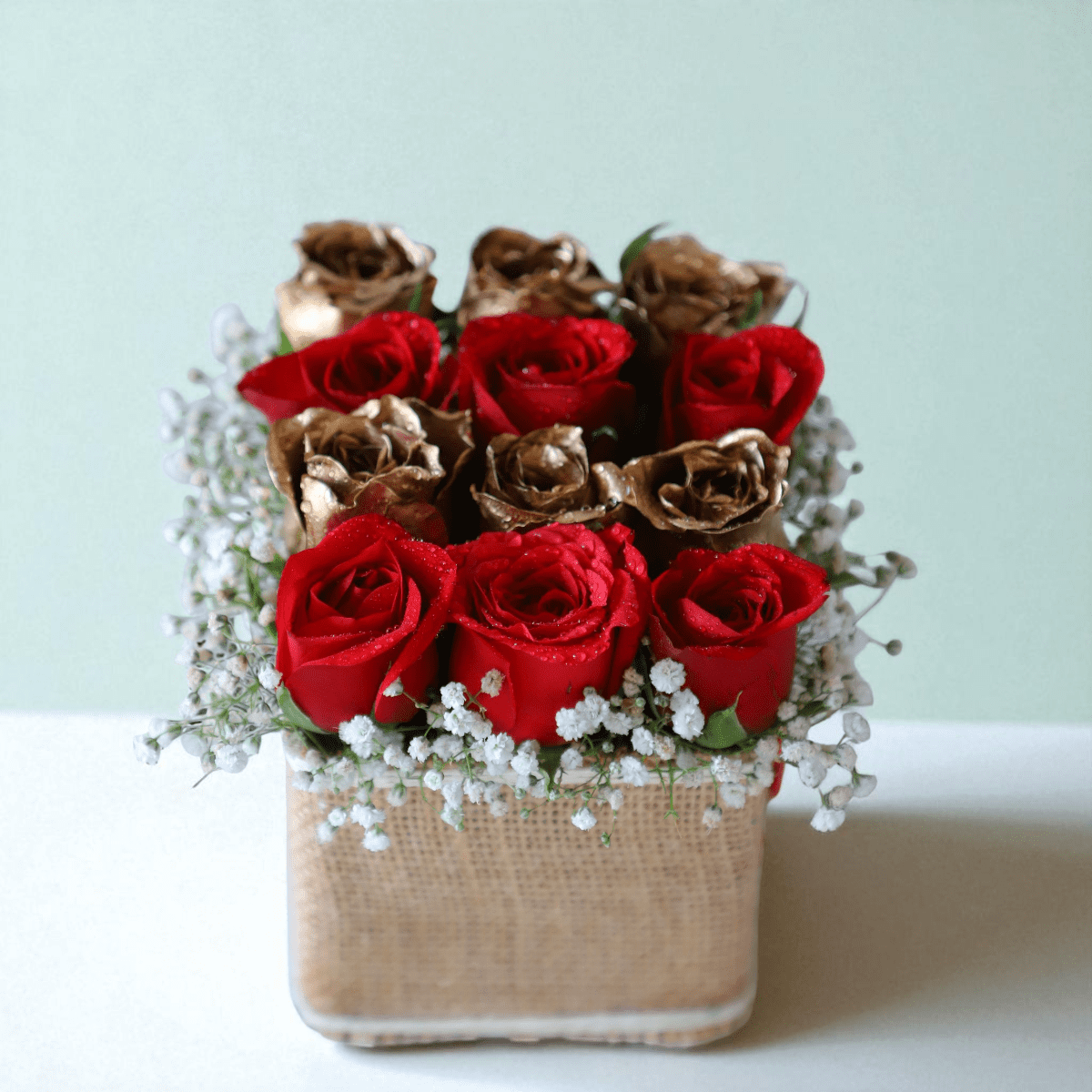 Gift your loved ones a piece of elegance with this Red and Golden Roses Vase Arrangement – a true symbol of luxury and love.