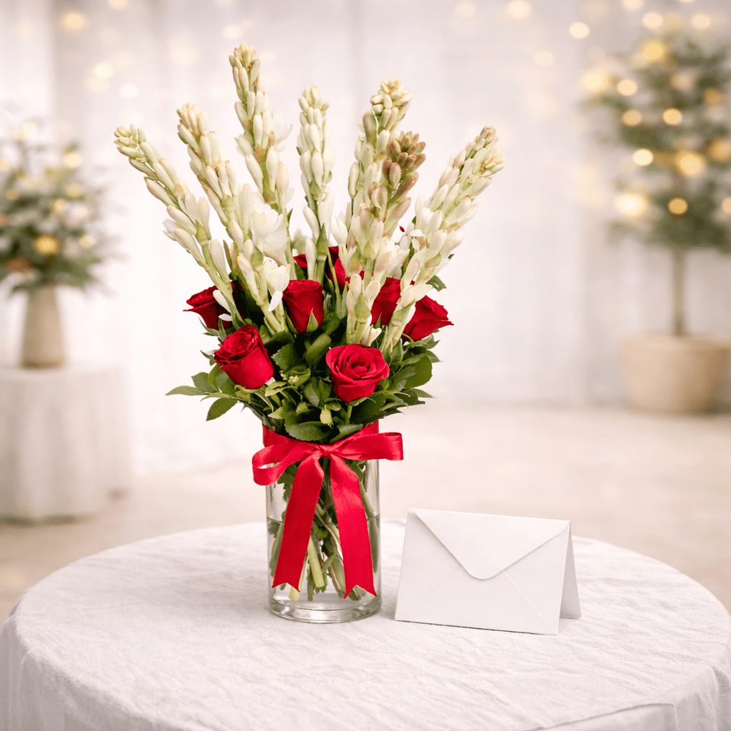 The deep, velvet red of the roses symbolizes passion and enduring love. Meanwhile, the pristine white tuberoses add a layer of purity and a mesmerizing fragrance that fills the room. Furthermore, we arrange these in a sleek, high-quality Glass Vase and finish the look with a luxurious Red Satin Ribbon. Therefore, this centerpiece will certainly capture everyone’s attention.