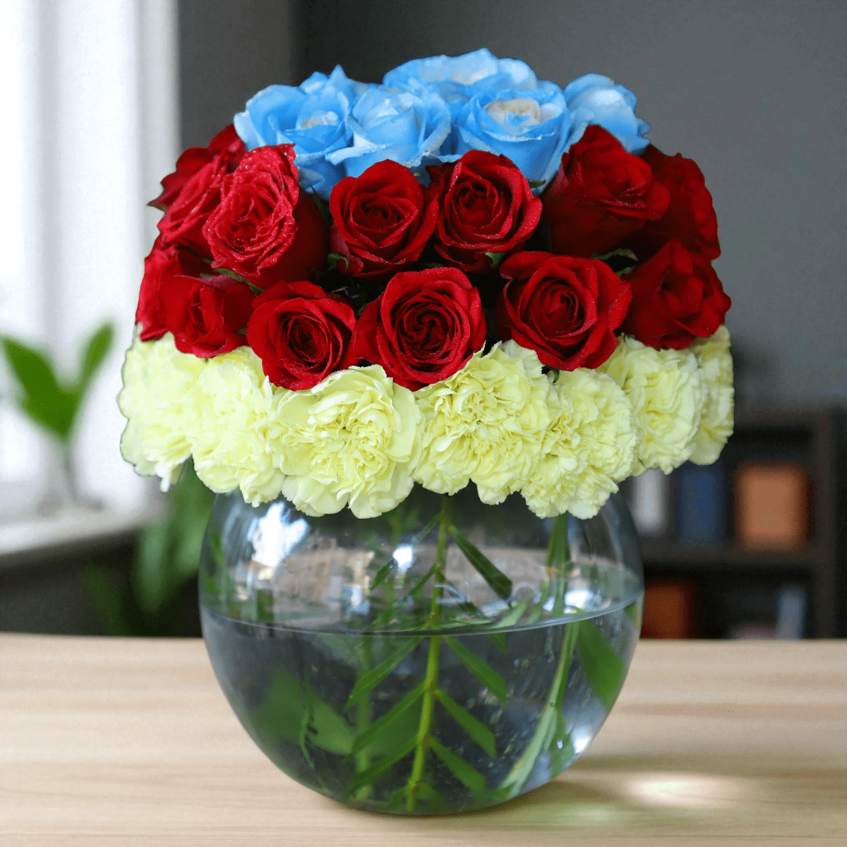 Bring home a vibrant symbol of beauty and unity with this stunning Tricolor Flower Vase Arrangement. Designed with care, this bouquet features fresh blue roses, passionate red roses, and cheerful yellow carnations arranged in a layered pattern inside a round glass vase. Its striking tricolor effect creates a visual delight that is both modern and elegant, making it an unforgettable surprise for your loved ones.