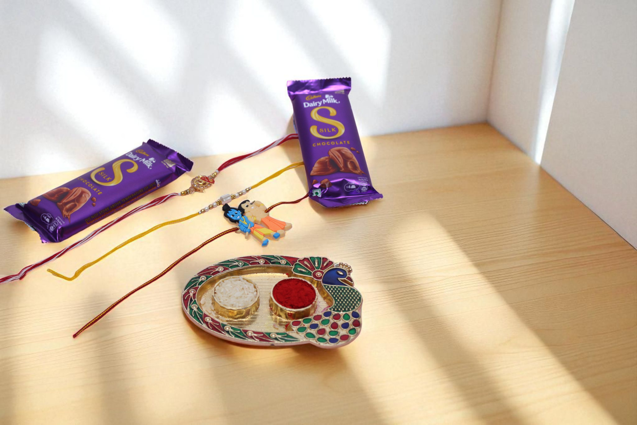 | Celebrate Raksha Bandhan with triple the love and blessings through our Trio Rakhi Delight Combo. This thoughtful set features three uniquely crafted rakhis for your dearest brothers, covering all age groups and preferences. Ganpati Rakhi symbolizes protection and prosperity Pearl Rakhi reflects elegance and grace, ideal for elder brothers Kid Krishna Rakhi adds fun and innocence for your little sibling To sweeten the moment, we’ve included two Dairy Milk Silk bars—a creamy indulgence to mark this special occasion with happiness and taste. Also included is a decorative roli chawal thali, keeping tradition alive and pure. Note: Props like background boards or sunlight in photos are for presentation only. Actual delivery includes only listed items. 🚚 Delivery Info: Available for same-day delivery in Mumbai, Navi Mumbai & Thane. Choose your delivery time slot during checkout. 📸 Photography Disclaimer: Images shown are for reference. Minor variations in Rakhi design or packaging may occur depending on availability. |