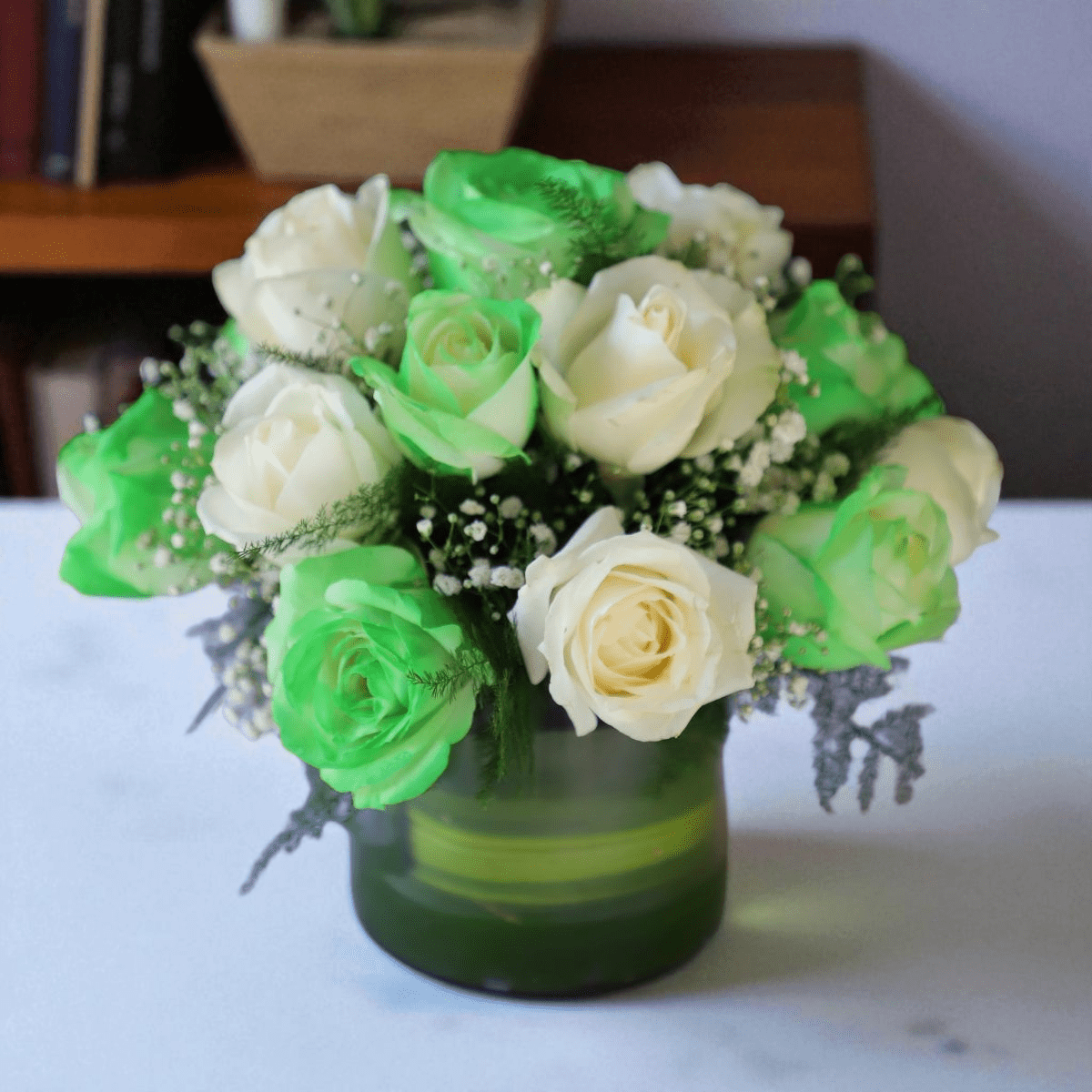 | • 8 Elegant White Roses • 8 Vibrant Green-Tinted Roses • Decorated with Gypsy Fillers & Green Ferns • Arranged in a Round Green Glass Vase • Ideal for Tables, Corporate Desks & Thoughtful Gifting |